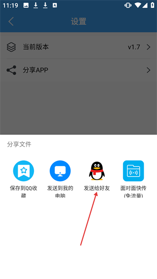 4、在【设置】中找到【分享APP】,选择【发送给好友】可将APP分享给QQ好友。