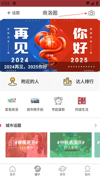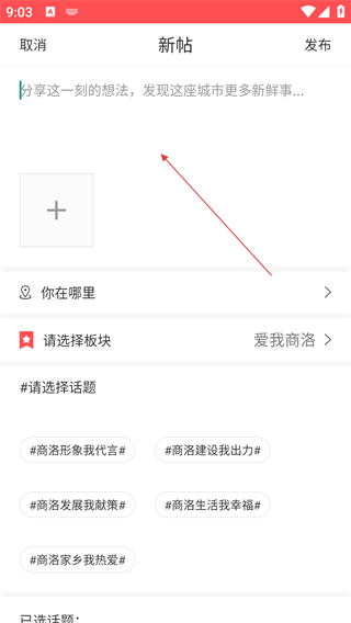 3、在商洛圈页面,点击右上角相机图标,进入新帖发布的编辑界面。