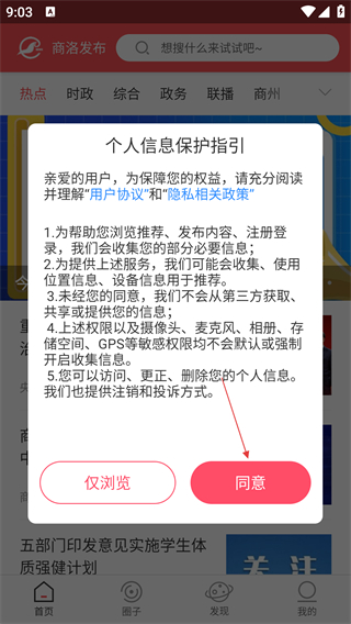 1、打开APP,在弹出的个人信息保护指引弹窗中点击【同意】,进入应用主界面。