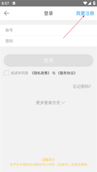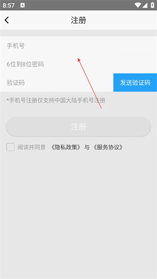 4、在注册页面填写手机号、设置6-8位密码、获取并输入验证码,勾选协议后点击【注册】完成账号注册。