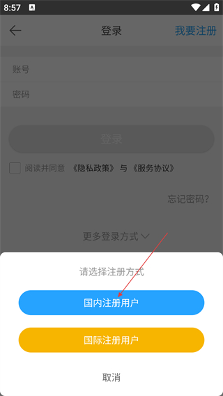 3、在弹窗中选择【国内注册用户】,进入注册信息填写界面。