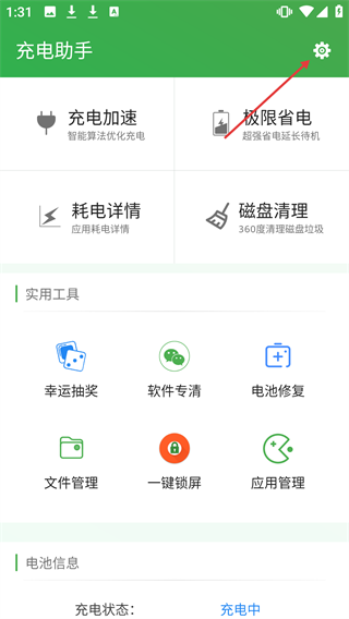 1、在【充电助手】主界面点击右上角设置图标,进入设置页面。