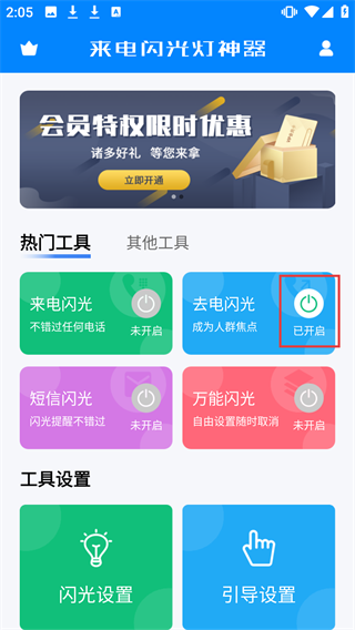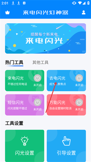 1、在【来电闪光灯神器】主界面点击【去电闪光】,进入去电闪光设置页面。