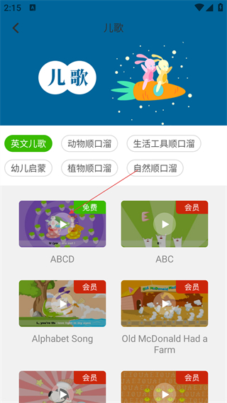 3、在儿歌页面选择目标内容(如“ABCD”),进入该儿歌的详情界面。
