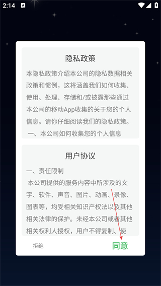 1、在隐私政策与用户协议弹窗中点击【同意】,进入主界面。