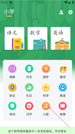 2、在主界面的小学板块下,点击【儿歌】功能入口,进入儿歌学习页面。