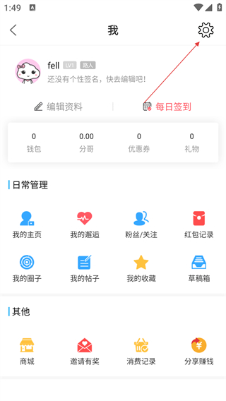 1、在个人中心页面,点击右上角【设置】图标,进入设置界面。