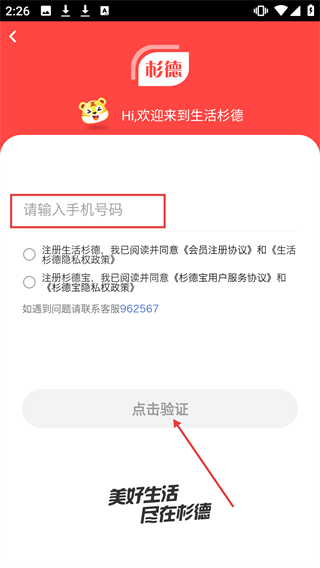 3、在注册页面输入手机号码,选择同意相关协议后点击【点击验证】。