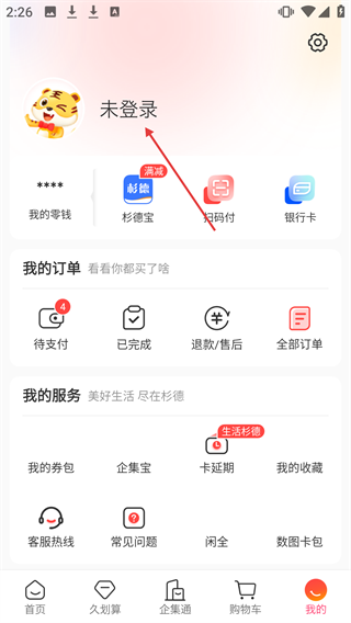1、在“我的”页面点击【未登录】,进入登录注册界面。