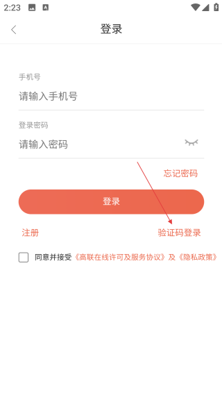 3、在登录页,点击【验证码登录】,切换到验证码登录的信息填写页。