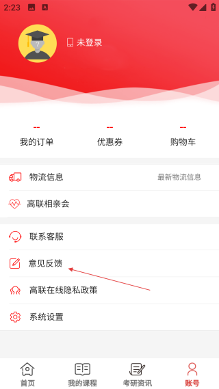 2、在账号页,点击【意见反馈】,进入反馈信息的填写界面。