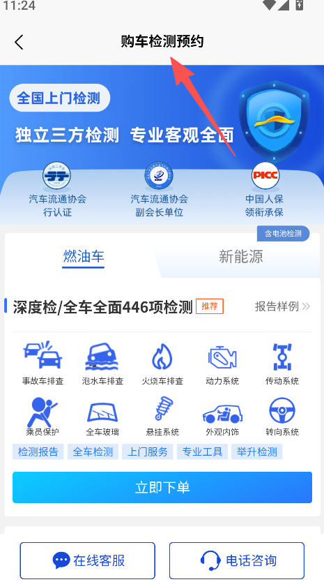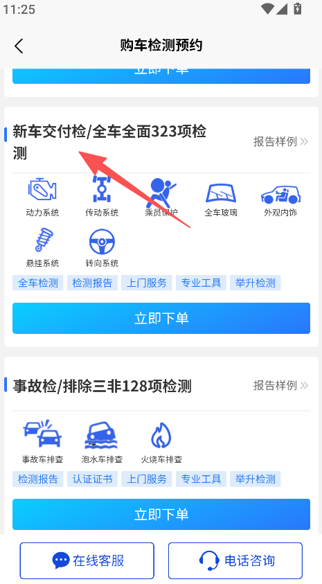 1、具备检测类型选择功能,支持深度检、新车交付检等多种检测项目选择,方便用户根据购车需求针对性预约检测。