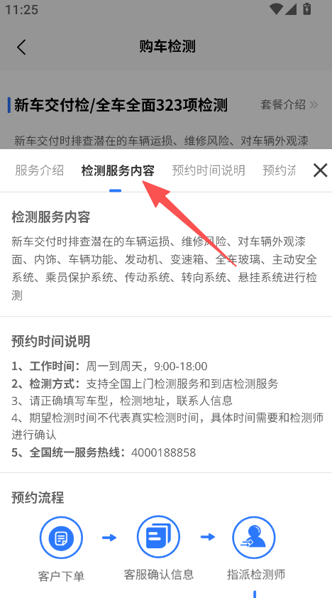 2、服务透明详尽,检测项目、时间说明、流程等详细展示,即使是购车新手也能清晰了解检测全貌,体验佳。