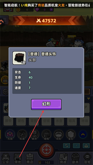 3、获得装备(如普通头饰)后,可点击【幻形】功能改变装备外观,同时提升角色的攻击、生命、防御和速度属性。
