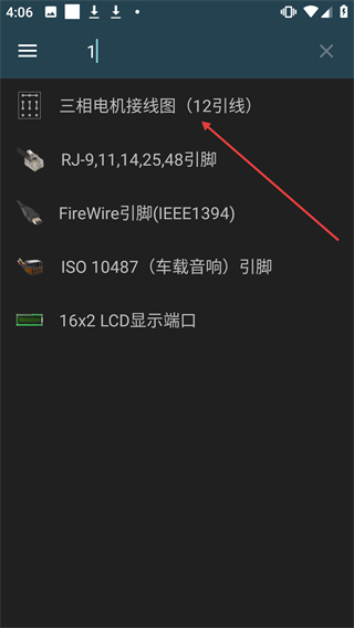 2、在搜索页面输入内容后,选择【三相电机接线图(12引线)】,进入接线图详情页。
