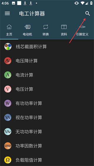 1、在【电工计算器】主界面点击右上角搜索图标,进入搜索页面。