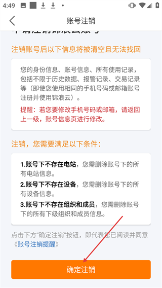 4、确认满足注销条件后点击【确定注销】,完成账号注销。