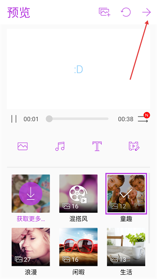 3、在预览页面选择“童趣”等主题后,点击右上角箭头进入分享页面。