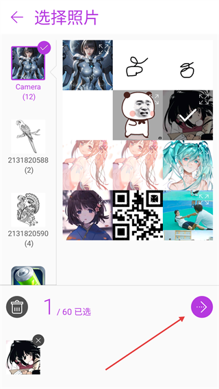 2、在选择照片页面选好目标照片后,点击右下角箭头进入预览页面。