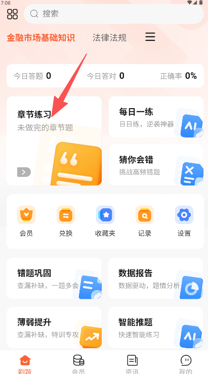 2、在首页选择“章节练习”功能进入金融市场基础知识等科目章节列表。