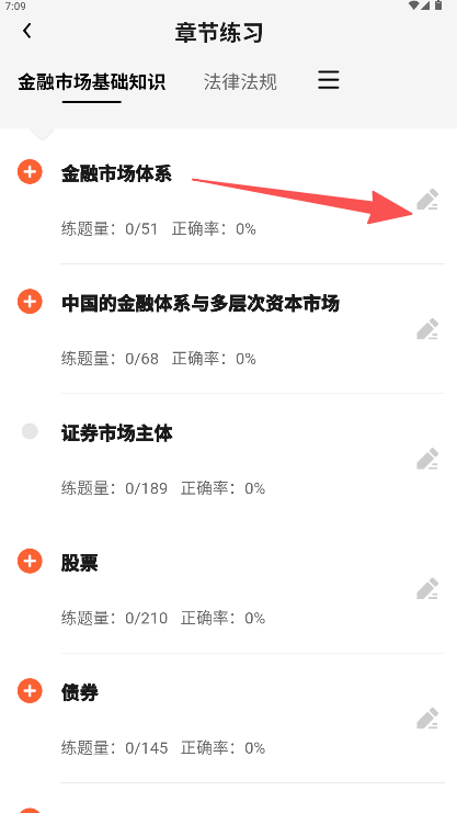 3、在章节列表选择目标章节如“金融市场体系”点击编辑图标开始练习。