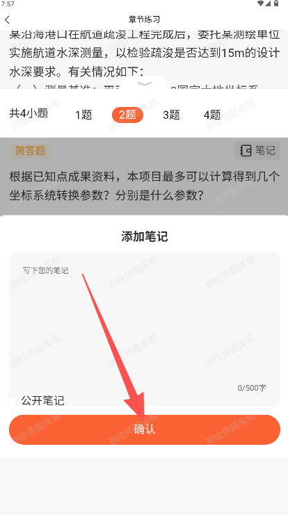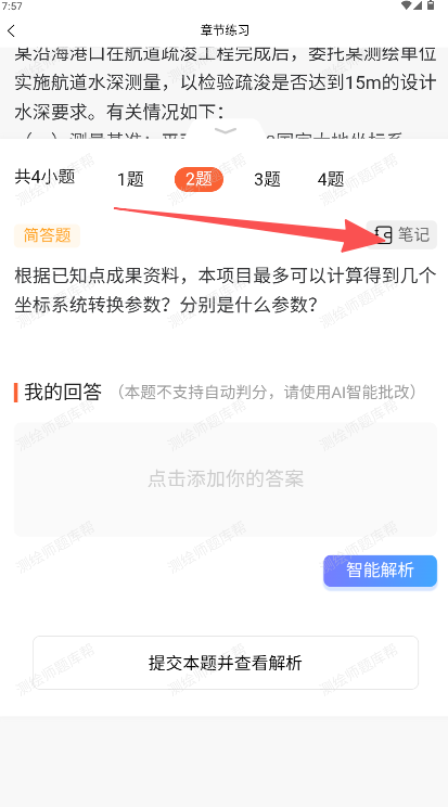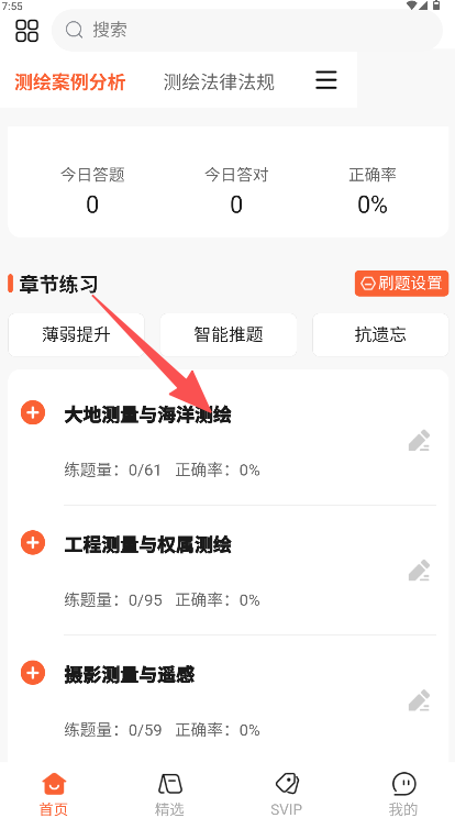 1、在首页“章节练习”模块选择“大地测量与海洋测绘”科目进入。