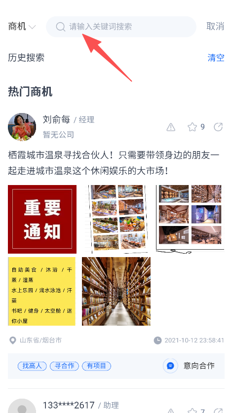1、使用搜索功能,输入关键词查找商机。