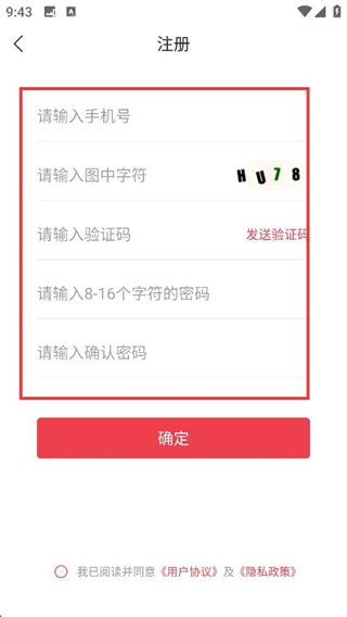 4、在注册页面,依次填写【手机号】、【验证码】、【密码】及【确认密码】点击【确定】完成注册。
