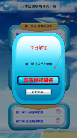 3、遇到解锁弹窗,可点击【观看视频解锁】获取课程权限,继续学习对应的课文内容。