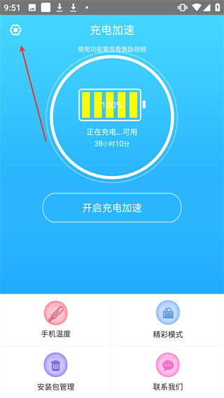 2、在【充电加速】界面,点击左上角设置图标,可进入设置页面进行相关功能配置。