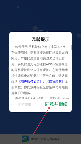 1、使用【手机快速充电加速器】时,需阅读《用户服务协议》《隐私政策》后点击【同意并继续】方可使用。