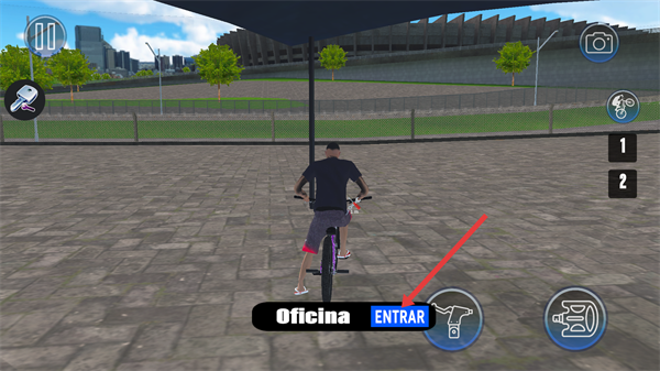 4、到达修理店区域后,点击【Oficina-ENTRAR】按钮,进入修理店,可对自行车进行维修等操作。
