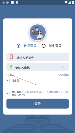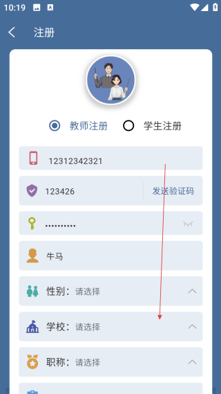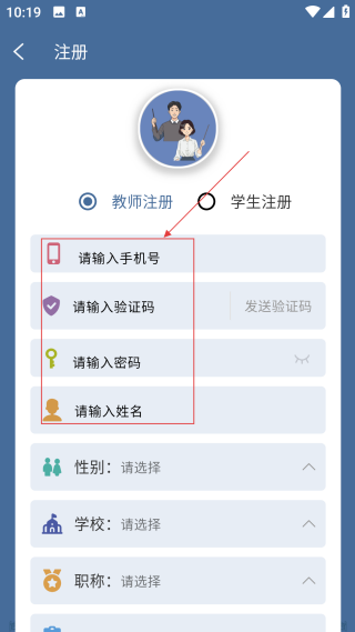 2、在教师注册页,依次填写【手机号、验证码、密码与姓名】等基础信息,准备注册。