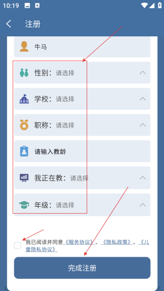 4、【补充性别、学校等信息并勾选协议】后,点击【完成注册】提交,即可完成注册流程。