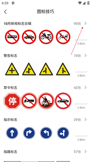 1、在主界面点击【图标技巧】选项,进入交通标志相关的学习页面。