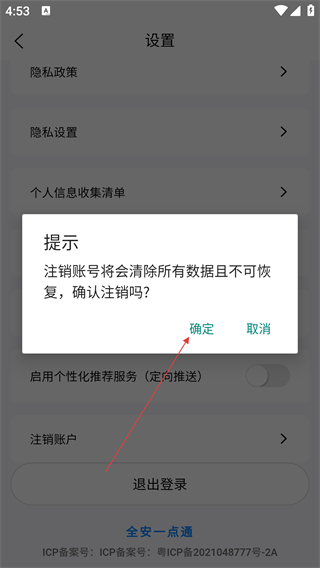 4、在弹出的提示弹窗中,确认注销风险后点击【确定】,完成账户注销操作。
