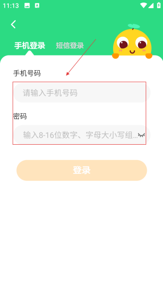 3、在手机登录页,依次填写【手机号、密码】,准备填写对应信息。