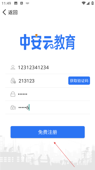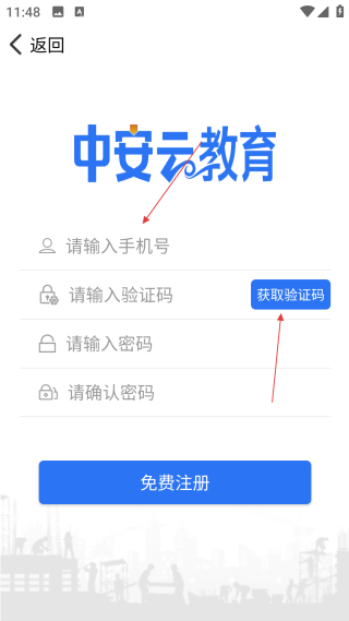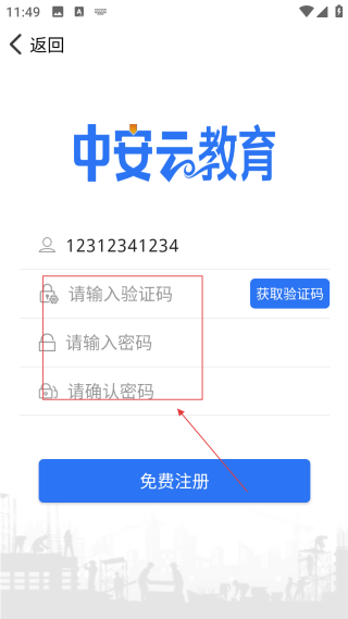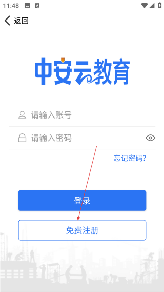 1、在中安云教育登录页,点击【免费注册】,进入账号注册的信息填写界面。