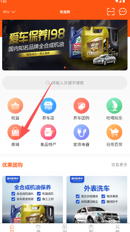 1、在首页点击九宫格区域的“商城”图标进入奇龙商城页面。