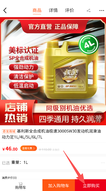 2、在商城浏览或通过分类找到目标商品如基利斯全合成机油。
