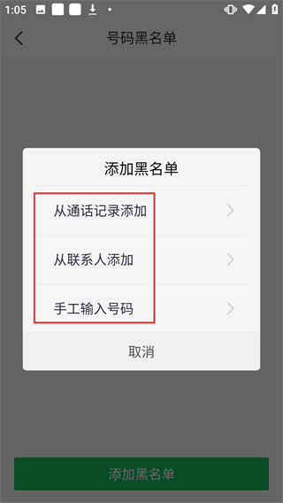 4、在【号码黑名单】的添加选项中,可选择【从通话记录添加】【从联系人添加】【手工输入号码】来添加黑名单号码。