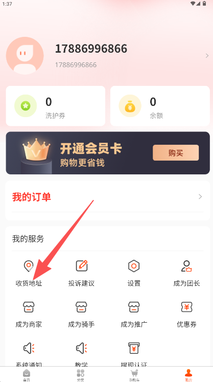 2、在个人页点击“我的服务”区域的“收货地址”图标进入管理页面。