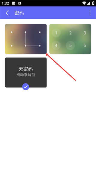 2、在密码选择页面选择图案密码选项,进入图案密码绘制页面。