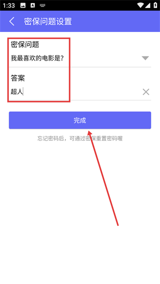 4、图案密码设置完成后,进入密保问题设置页面,输入密保问题答案后点击【完成】按钮,完成密保问题的设置。