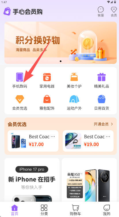 3、集成商品分类浏览服务,可按手机数码、家用电器等品类查找目标兑换商品。