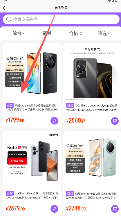 2、在商品列表浏览并选择目标手机如“荣耀”查看详情。