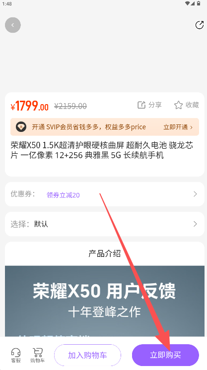 3、在商品页确认优惠后点击“立即购买”完成下单。