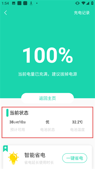 4、进入充电记录页面,可查看当前电量及设备状态等信息。