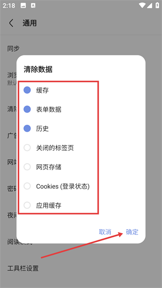 4、在清除数据选择框中选择要清除的数据(如缓存、表单数据、历史等)后,点击【确定】按钮,完成数据清除操作。