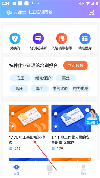 1、在云课堂电工培训网校首页点击【1.1.1.电工基础知识-李俊】课程,进入课程播放页面。